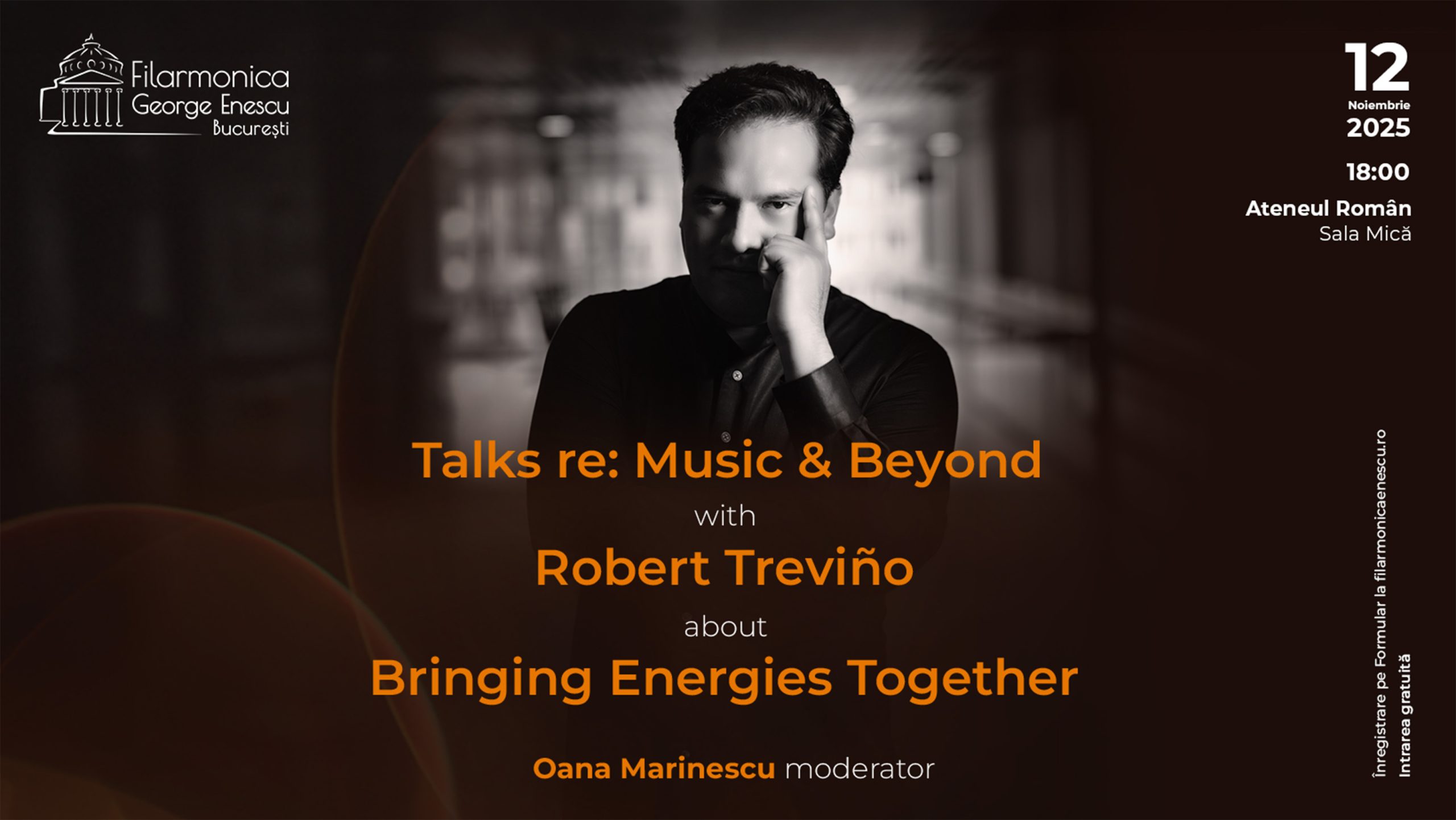 Tema acestui dialog rezonează profund cu personalitatea dirijorului Robert Treviño și cu atenția specială pe care acesta o acordă unei abilități esențiale atât în artă, cât și în viață: aceea de a ști cum să aduci totul împreună, oferind în același timp spațiul necesar pentru ca energiile, ideile și oamenii să se manifeste liber. Întâlnirile Talks re: Music & Beyond își propun să creeze momente de prezență, în care experiența împărtășită de artiști se extinde mult dincolo de muzică. Evenimentul se va desfășura în limba engleză.